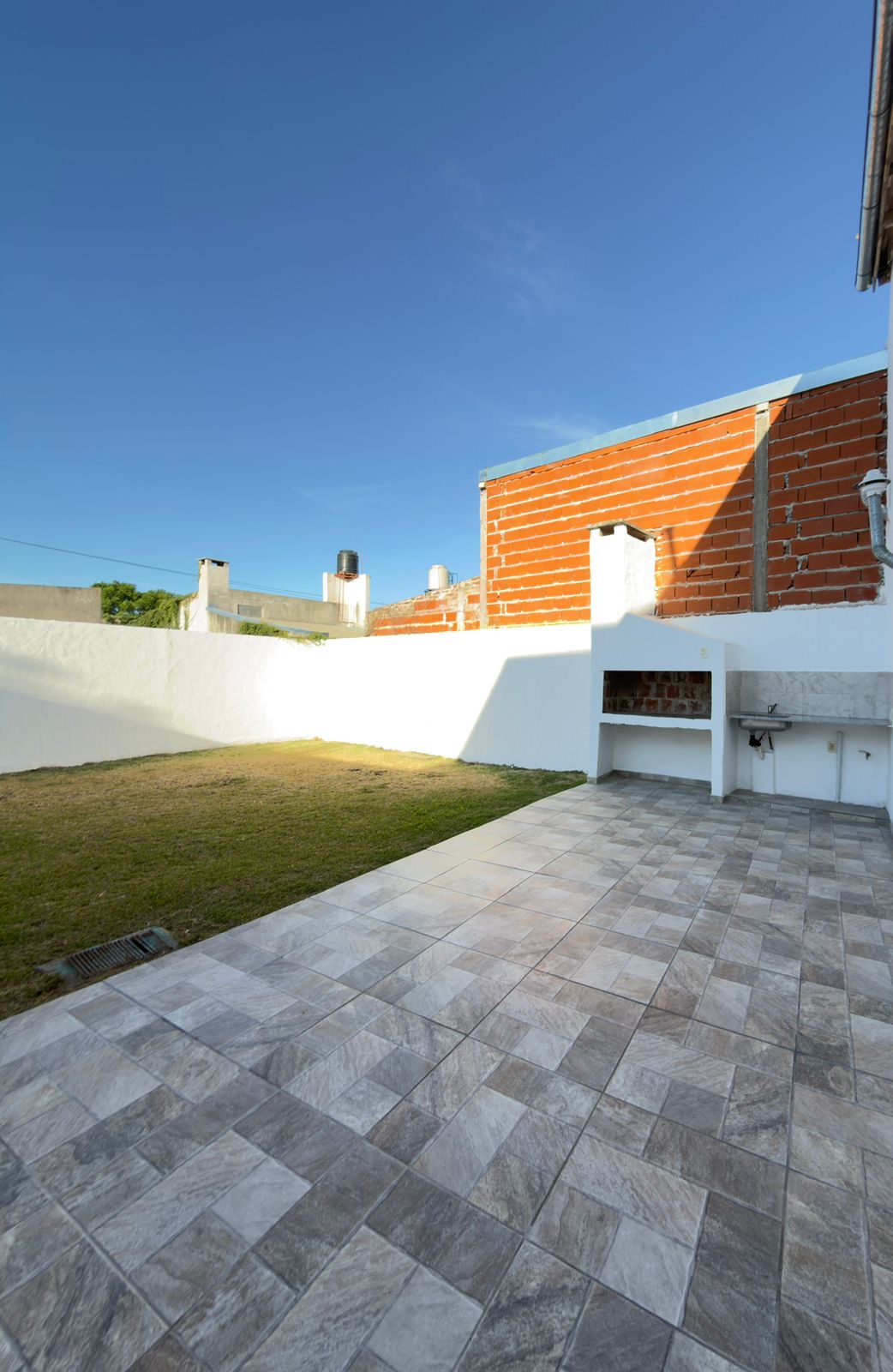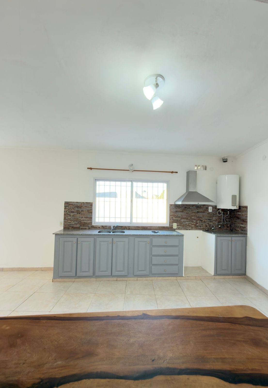 Cocina–comedor integrado, living espacioso, baño de servicio, lavadero y patio trasero con césped y churrasquera.